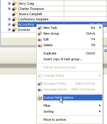 - Select task group for which you need to view the total or average accounts receivable, right click and select "Custom fields options"